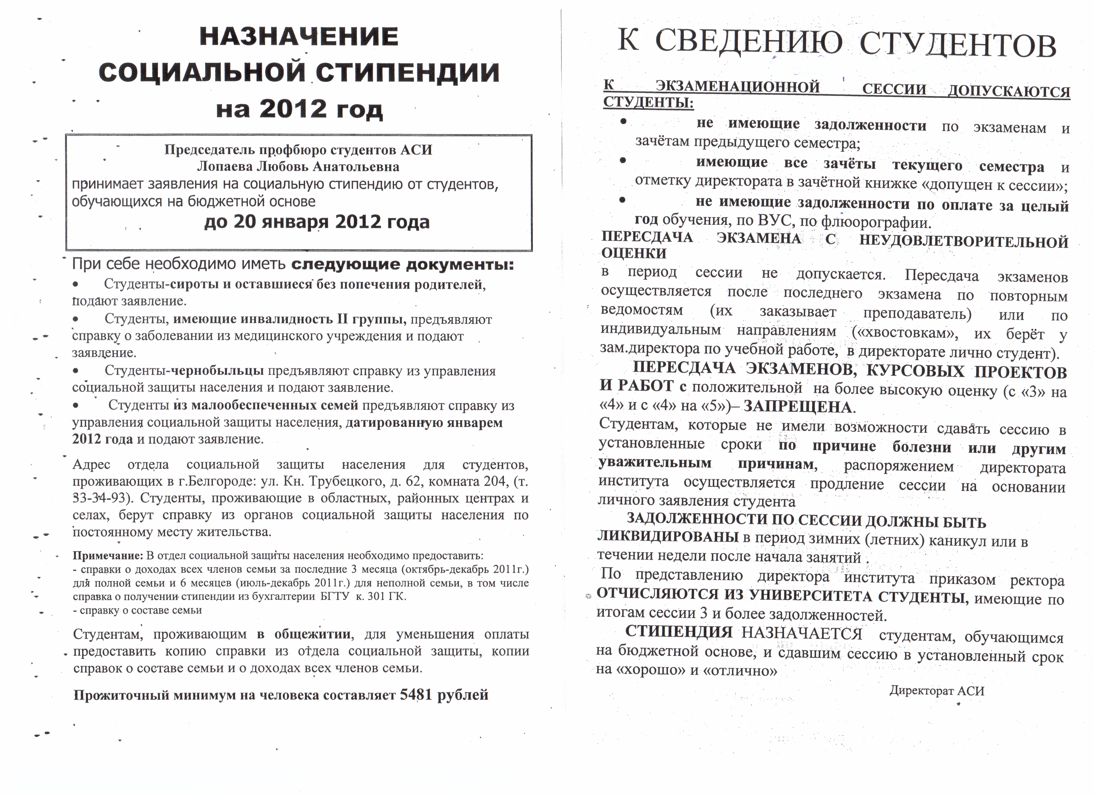Председатель профбюро студентов АСИ Лопаева Любовь Анатольевна принимает заявления на социальную стипендию от студентов, обучающихся на бюджетной основе до 20 января 2012 года.